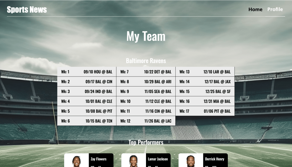 My Sports Team web app was my first project that I designed and created from the ground up. It’s a web app designed to allow users to keep up with their favorite NFL team. the App allows user’s to select a team, which will then load schedule data and player data on the “profile” page.